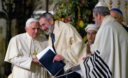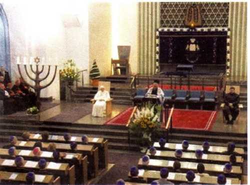 «Dans "Discours à la Synagogue de Rome", Benoît XVI, 17 janvier 2011 : « Nombreuses peuvent être les implications qui dérivent de l’héritage commun tiré de la Loi et des Prophètes. Je voudrais en rappeler certaines : tout d’abord, la solidarité qui lie l’Eglise et le peuple juif au niveau même de leur identité spirituelle et qui offre aux chrétiens l’opportunité de promouvoir un respect renouvelé pour l’interprétation juive de l’Ancien Testament »